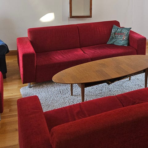 Soffgrupp bestående av en 3-sits soffa och två fåtöljer i mörkt rött tyg.