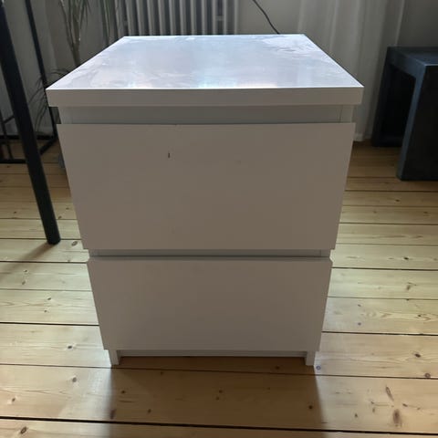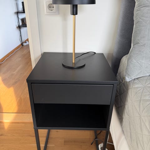Vitt sängbord med handtag i matt silver med 1 låda och 1 hylla.