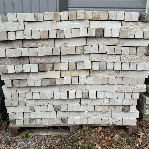 Betongplattor / marksten i grå färg. Plattorna ligger staplade på pallar och finns i flera olika storlekar och tjocklekar, både mindre kvadratiska plattor och större rektangulära plattor. Passar för exempelvis gångar, uteplats, uppfart eller andra ytor utomhus där man vill ha ett hårdgjort underlag av betongsten.