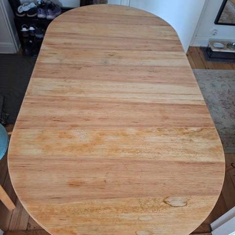 Utdragbart matbord Timeless 02 från Haslev. Bordet har en diameter på 105cm men med de två inläggsskivorna på 47,5cm får du ett 2meter långt bord. Stålben med ett extra stödben (fästs i underredet) i trä som man kan sätta fast när man använder inläggsskivorna. Bordet är köpt på Svenska Hem 2017.