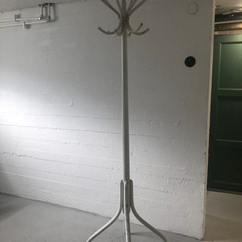 Fristående klädhängare i vit färg med rund marmorfot. Överst finns flera krokar för jackor, kappor och accessoarer. Längre ner sitter extra krokar för väskor eller mindre plagg. Passar för hall, sovrum eller kontor där man behöver upphängning för kläder och ytterplagg.