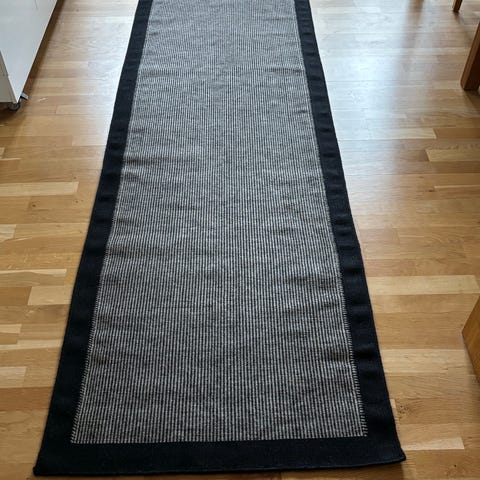 Plastmatta i fint skick. Svart/skiftande i mörkt blå. Fin som hallmatta eller liknande.