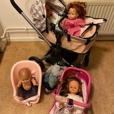 Setet inkluderar en dockvagn med handtag i metall och tyg i rosa nyans samt en docka med kläder och en säng. Lämpligt som leksak för barn som vill leka med dockor, köra runt dem i vagn och lägga dem i säng.