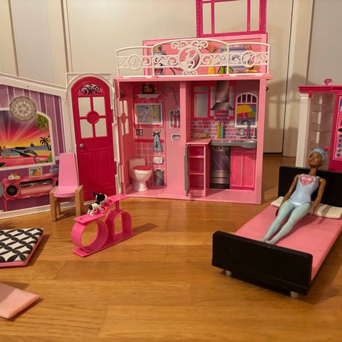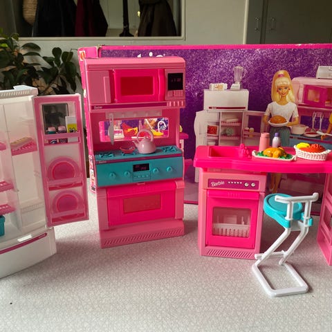 Barbie garderob i rosa plast. Skåpet har dubbeldörrar och flera fack och hyllor för förvaring av dockkläder och tillbehör. Avsedd för Barbie-dockor och liknande dockor i samma storlek.
