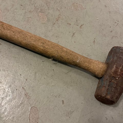 Penhammare med träskaft. Metallhuvud och långt handtag i trä, lämplig för allmänna snickeri- och hantverksarbeten i hemmet eller verkstaden. 2m måttband. Pris 120 kr