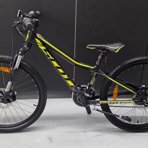 Barncykel från kultmärket Cannondale med 24" hjul. Cykeln har ram i blå metallic med detaljer i silver och neon. Utrustad med 8 växlar, framdämpare, stöd, skärmar och skivbromsar fram och bak.