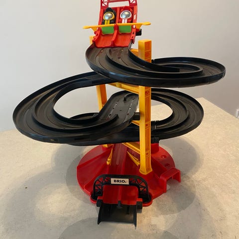 Parkeringsgarage med helekopterlandeplats, två bilar och en helekoptar.