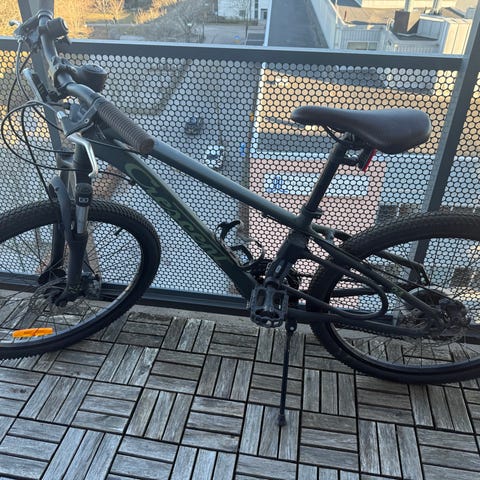Crescent mountainbike för unisex med ramstorlek M och 26" hjul. Cykeln har en svart ram med dämpad framgaffel och grovmönstrade däck anpassade för cykling på grus och lättare terräng. Utrustad med standardpedaler, sadel och stöd. Passar för vardagscykling och fritidsturer på blandat underlag.
