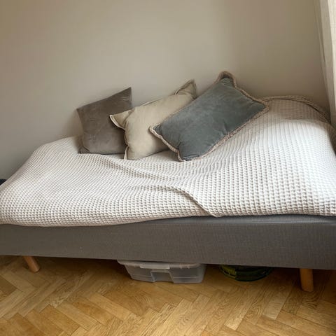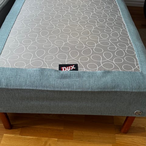 Extremt skön DUX 1001 Medium säng 90x200cm med bäddmadrass Duxiesta de Luxe i grått/vitt tyg. Sängen är en enkelmodell med klassisk DUX-fjäderkonstruktion och textilklädd resårbotten. Bäddmadrassen är avtagbar och ligger ovanpå resårdelen. Passar som enkelsäng i sovrum, gästrum eller som extra säng. Ben ingår enligt bild.