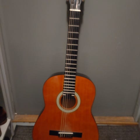 Akustisk klassisk barn gitarr i naturfärgad träfinish. Gitarren har nylonsträngar, greppbräda med bandmarkeringar och traditionell ljudhålskant med dekor. Levereras tillsammans med ett mjukt svart fodral med bärhandtag och ytterficka för tillbehör. Passar för spel hemma, i skolan eller till övning och enklare framträdanden.