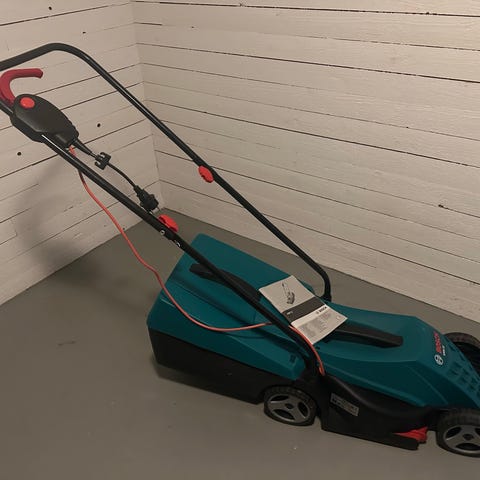Biltema gräsklippare med eldrift i blå färg. Modellen har uppsamlare baktill för gräsklipp och höjdjusterbart handtag. Strömkabel ansluts framtill på klipparen. Passar för klippning av gräsmattor i trädgård eller runt hus där eluttag finns tillgängligt.