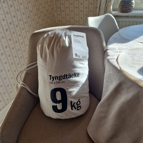 Tyngdtäcket väger 7 kg och är som nytt. Testade att använda det med påslakan 1 gång, men det var inte riktigt i min smak. Kan överlämnas i Kalmar, Torsås eller Gullabo.