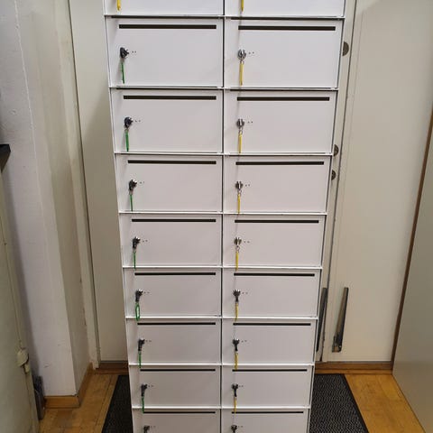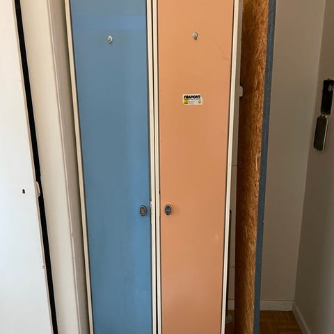 Förvaringsskåp, omklädningsskåp med bra ventilation. Har stått i ett garage, så vissa skönhetsfläckar och någon rostfläck finns. Det är ett stycke med två separata, låsbara (med hänglås) skåp.