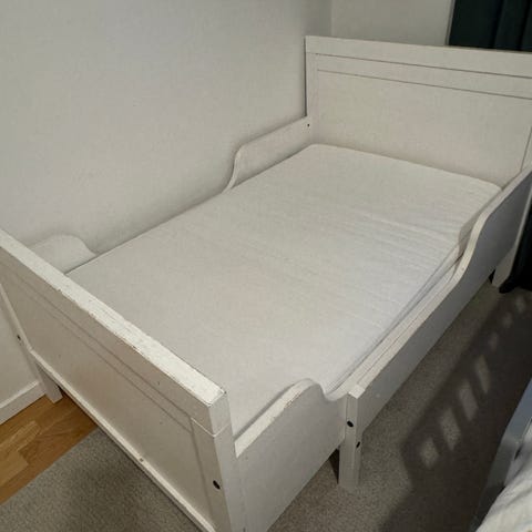 Fint skick, madrass ingår som alltid har använts med madrasskydd. Det finns en liten spricka på ena sidan, ej den nedtagbara sidan men det är inget som påverkar funktion (se bild). Överlag hel och fin, säljes pga flytt.