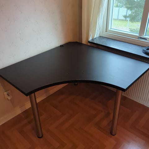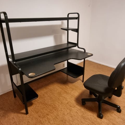 Skrivbord med avtagbar överdel. Stomme i metall, hyllplan under samt över i metall, skrivbordsskiva i trä, utdragbar hylla för tangentbord samt utdragbar hylla för mus som också är i trä.