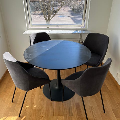 En matgrupp, knappt använd, uppvisar en skavank på en av stolarna, vilken uppstod under transport i släpkärra.