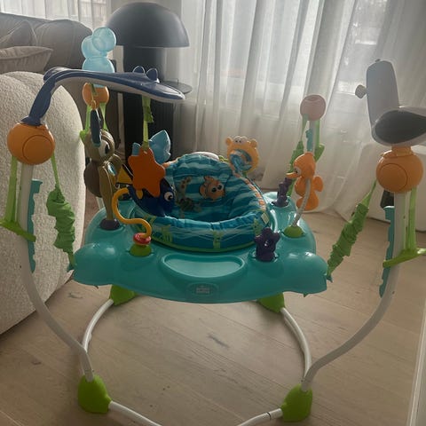 Hoppgunga som har varit jättebra för vår bebis. Det saknas dock en sådan där leksak i. Vet inte vart den tagit vägen. Men bra skicka annars.