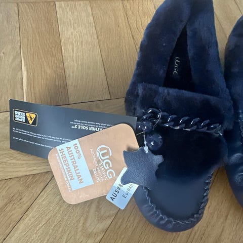 UGG tofflor i storlek 41. Modellen är i brun färg med ovandel i mjukt material och fodrad insida. Yttersulan är mönstrad för bättre grepp. Passar som innetofflor eller lättare användning utomhus på torra underlag.
