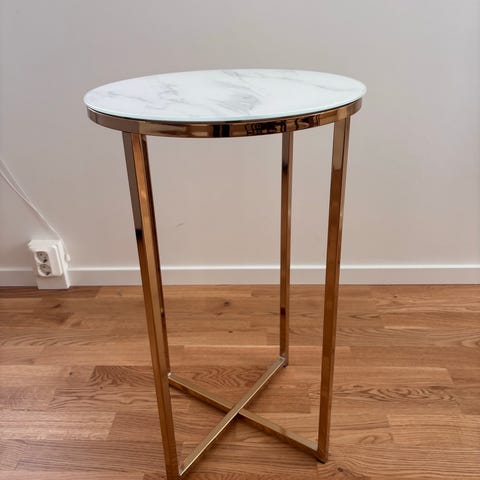 Sido- eller sängbord med en ljus äkta (tung) marmorskiva. Mässigfärgade ben. Marmorskivan kan lyftas bort. Skivan är ca 2 cm tjock