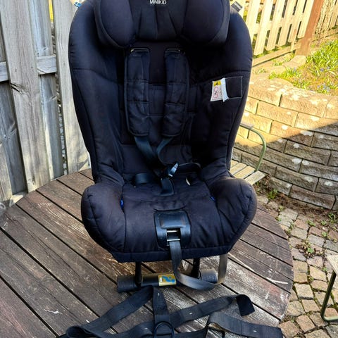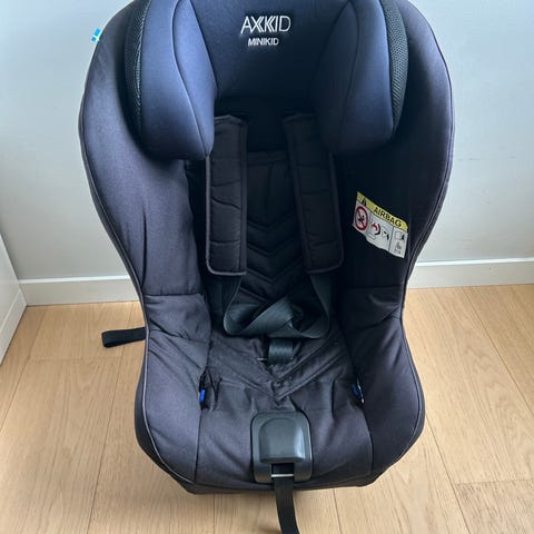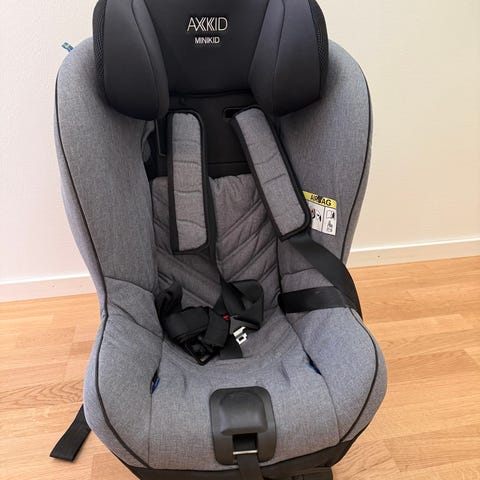 Axkid Minikid bilbarnstol med maxvikt 25 kg. Bakåtvänd stol i grått och svart tyg med integrerat huvudstöd och internsele. Stolen har stödben och förankringsband för montering i bilen. Passar barn upp till 25 kg enligt tillverkarens rekommendationer. Tyget är vadderat för ökad komfort och stolen har justerbart nackstöd. Lämplig som bilbarnstol för vardagsresor och längre bilfärder.