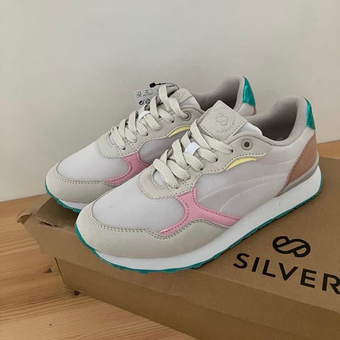 Hoka sneakers i storlek 38. Skorna har en flerfärgad ovandel med blandade pastelltoner och mörkare detaljer runt hälpartiet.