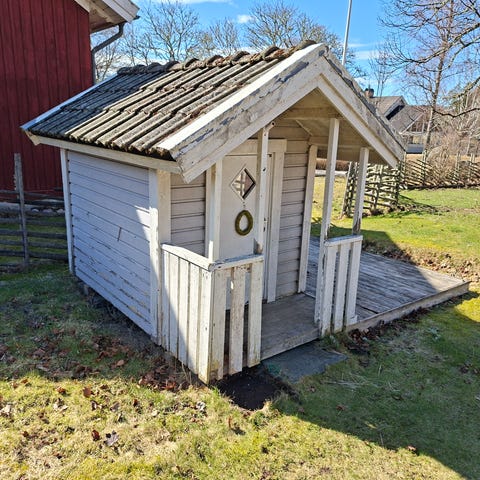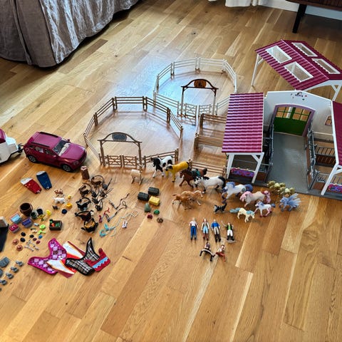 Stall i trä med öppningsbara tak. Huset har flera rum, öppningsbara dörrar och fönster. Taket är rött och väggarna i naturträ med målade detaljer. Passar för lek med exempelvis schleishhästar samt som inredningsdetalj i barnrum.