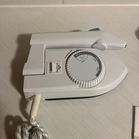 Oanvänt 19cm långt strykjärn. Ihopfällbart som syns på bild fem och sex. Perfekt att packa i en väska. Flera värmegrader och vattenspray funktion.