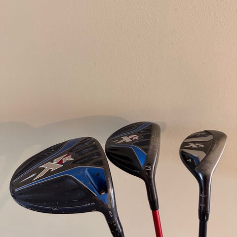 Ping G-serie golfklubbor av typen woods med tillhörande headcovers. Setet omfattar flera klubbor med grafitskaft och klubbhuvuden i mörk färg. Headcovers med Ping- och G-beteckning ingår för att skydda klubbhuvudena vid transport och förvaring. Lämpliga för golfspelare som söker woods från Ping G-serien.