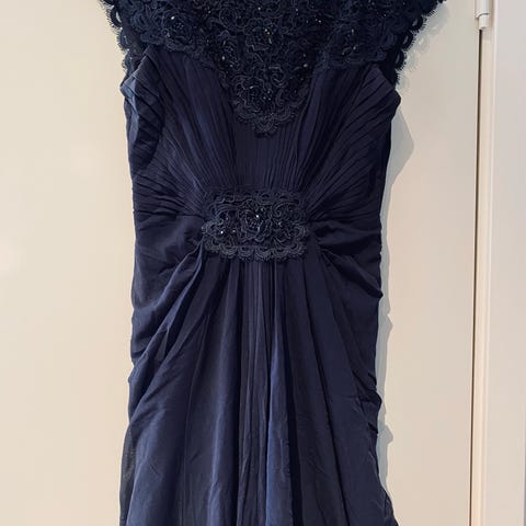 Ralph Lauren festklänning i storlek S. Klänningen är blå, med spetsliknande struktur. Modellen har korta, volangformade ärmar och rund halsringning. Passar som festklänning eller vid andra mer uppklädda tillfällen.