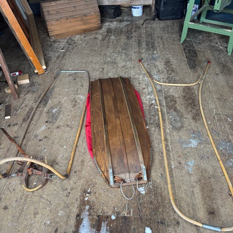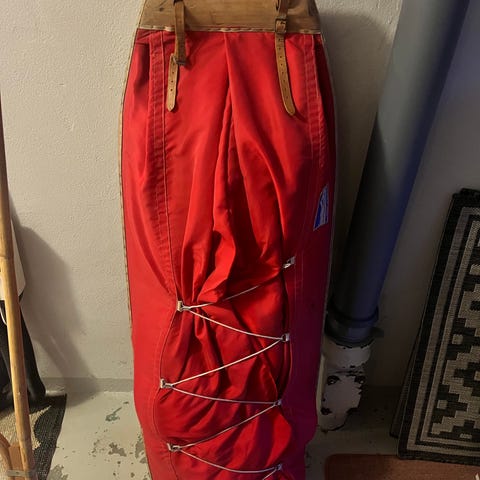 Pulka med högt ryggstöd och kapell i röd textil. Träram med böjda medar och metallbeslag. Sits med blå insida. Lämplig för att dra mindre barn på snöunderlag. Enkel konstruktion med plats för ett barn, kapellet hjälper till att skydda mot snö och vind. Passar för vinterlek och transporter i snömiljöer.