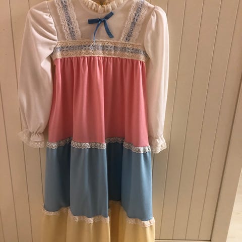En traditionell folkdrÀkt bestÄende av en vit blus med lÄnga Àrmar och en blÄ klÀnning med en gul kjol. KlÀnningen har detaljerade broderier med tusenskönor pÄ överdelen och lÀngs kjolens nederkant, vilket ger en charmig och autentisk kÀnsla. Blusen har en volangkrage och volanger vid Àrmsluten.