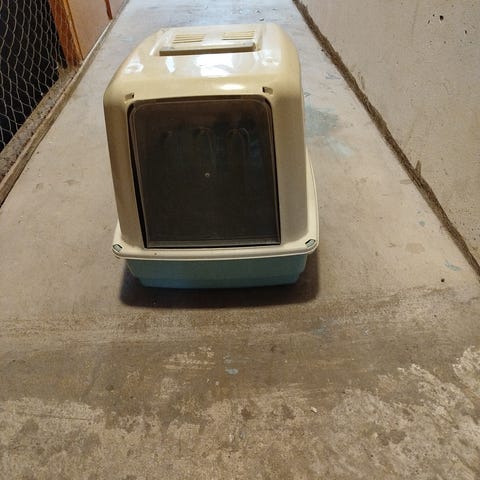 Kattlåda med huv och svängdörr i grå plast. Överdelen har ventilationsöppningar upptill. Lådan är avsedd för inomhusbruk för kattens toalettbehov och hjälper till att hålla sand och lukt mer avskärmad i hemmet.