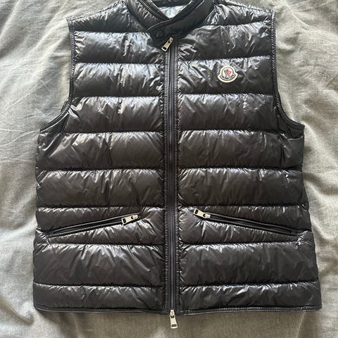 Moncler väst för herr i storlek L. Väst i gåsdun med quiltad design och hög krage. Färg mörkblå. Utrustad med dragkedja framtill och fickor med dragkedja. Innerficka. Luva i kragen.