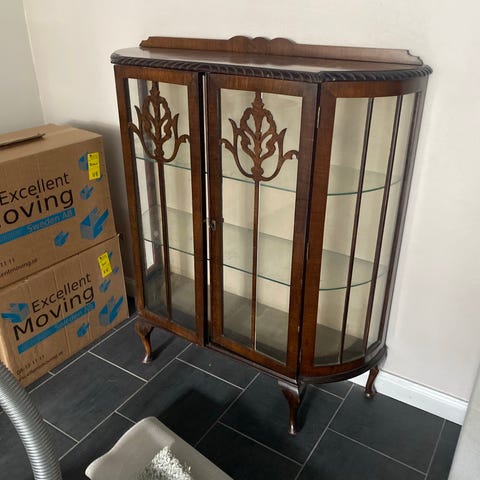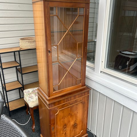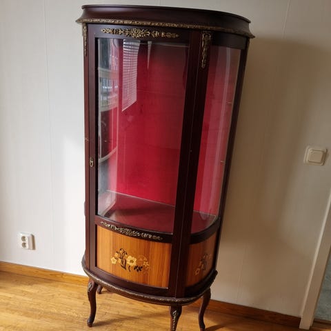 Vitrinskåp i trä med välvd front och glasdörrar. Skåpet har grönt innermålat utrymme med hyllplan, varav två i glas. Nederdel i trä med dekorativa intarsiadetaljer och beslag i metall. Passar för förvaring och exponering av porslin, glas eller prydnadsföremål i vardagsrum, matsal eller hall.