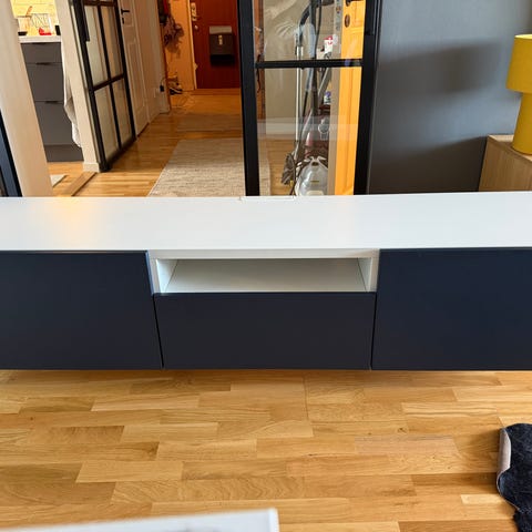 Säljer en stilren TV-bänk från IKEA av modellen BESTÅ. Perfekt för vardagsrummet med gott om förvaring för mediautrustning, spelkonsoler m.m. Fästen för väggmontering medföljer.