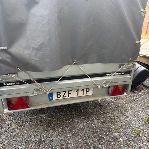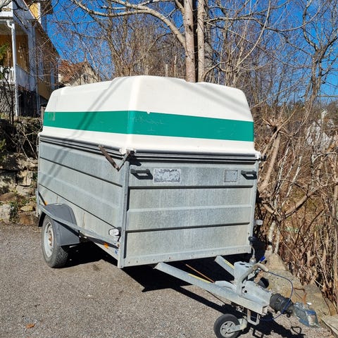 Släpvagn med kapell i grå färg. Vagnen har en öppen lastyta med sidor och ett heltäckande kapell som skyddar lasten mot väder och vind. Enaxlad konstruktion med dragkrok framtill och bakre ramp/läm för lastning och lossning. Utrustad med bakljus, reflexer och registreringsskyltshållare. Lämplig för transport av exempelvis möbler, byggmaterial eller annan skrymmande last som behöver skyddas under transport.