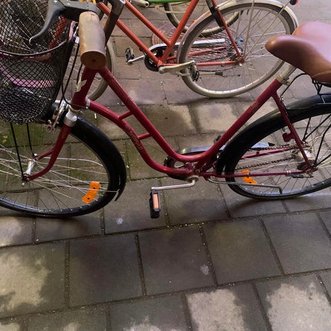 Cykeln har röd ram med lågt insteg, pakethållare bak och korg fram. Kedjeskydd och stänkskärmar är monterade. Navväxel från Shimano Nexus syns på bakhjulet. Utrustad med fotbroms bak och handbroms fram. Sadeln är justerbar i höjd.