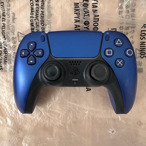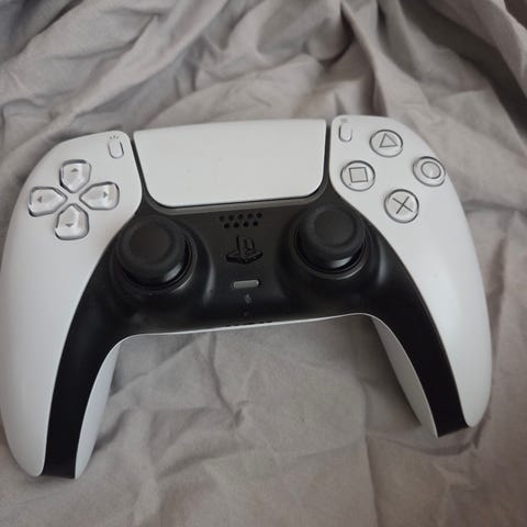 Sony DualSense handkontroll i vit färg. Trådlös spelkontroll avsedd för PlayStation 5 med inbyggda styrspakar, piltangenter, funktionsknappar och axelknappar. Utrustad med pekplatta, inbyggd högtalare och hörlursuttag. Passar för spel på kompatibla PlayStation-enheter och vissa datorer beroende på stöd och anslutningssätt.