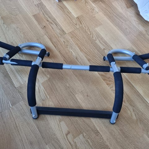 Iron Gym pull up-bar i svart färg. Monteras i dörrkarm för chins, pull ups och andra överkroppsövningar. Eller bara lägga på golvet för andra övningar. I princip oanvänd.