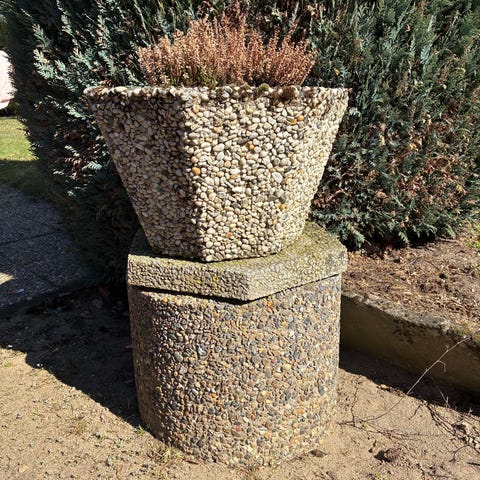 Rektangulär kruka i grå betong. Passar för utomhusbruk på exempelvis altan, balkong eller vid entré. Stabil konstruktion som lämpar sig för plantering av blommor, buskar eller mindre växter. Neutral färg som är lätt att kombinera med olika typer av växter och miljöer. Krukorna finns i olika storlekar. Det finns två stycken i storlek 40x40 cm och höjd 40 cm (pris 150 kr/st), en styck i storlek 30x30 cm och höjd 30 cm (pris 100 kr), en styck i storlek 32x32 cm och höjd 45 cm (pris 100 kr) och en styck i storlek 19x19 cm och höjd 13 cm (pris 50 kr).