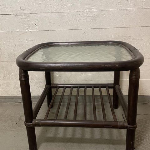 Satsbord i två delar med ekfanér. 70x70, höjd 50 cm och 67x61,5, höjd 44 cm.
