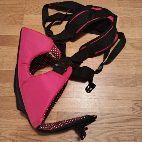 Baby Seat hoppgunga i röd färg. Selen är utformad för små barn som kan hålla huvudet stadigt själva. Produkten består av en tygsele med dragkedja baktill, upphängningsremmar, metallkedja och bygel för montering i tak eller dörrkarm enligt anvisningar. Hoppgungan används för att barnet ska kunna sitta säkert fastspänt och röra sig upp och ner med stöd av fjädringen. Passar inomhusbruk och bör monteras enligt medföljande instruktioner för säker användning.