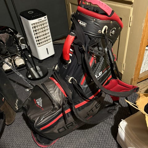 Cobra golfbag. Utrustad med bärremmar och utfällbara ben för att kunna stå stabilt på marken. Flera fickor för förvaring av golfbollar & tillbehör