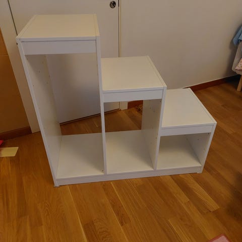 Trofast i bra skick, vitlaserad furu, som den säljs alltså. Två stora blå backar och två små vita. Finns i Hammarby Sjöstad.