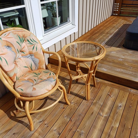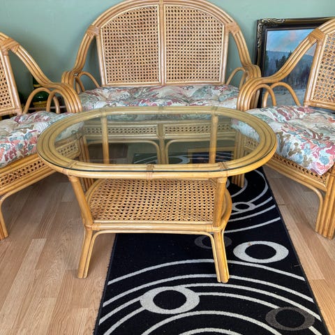 Soffa i rotting med stoppad sits och ryggstöd. Dynan har blommigt mönster med gula och vita blommor mot mörkblå bakgrund. Möbeln är avsedd för sittplatser inomhus eller i inglasat utrymme. Rottingstommen ger en lätt och luftig känsla medan den tjocka dynan ger mjukare sittkomfort.