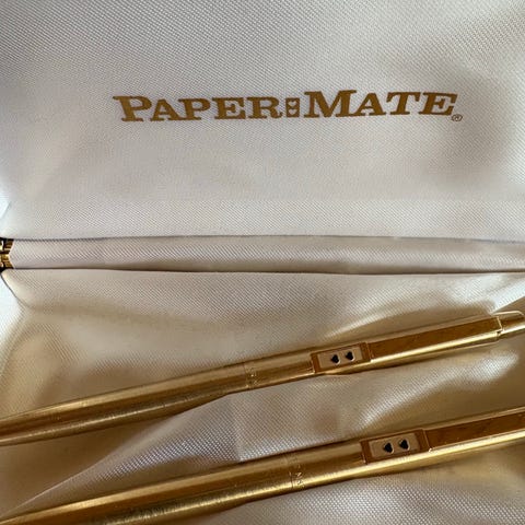 Set med två kulspetspennor. En penna är grön med 14k guldfärgade detaljer från ExtraFilm.