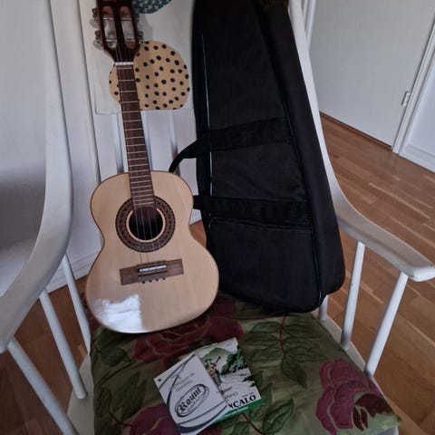 Klassisk nylonsträngad akustisk gitarr med naturfärgad topp och mörk baksida och sarg. Gitarren har traditionell kropp i klassisk modell, greppbräda med bandmarkeringar samt stall för nylonsträngar. Lämplig för spel i hemmet, övning och enklare framträdanden.