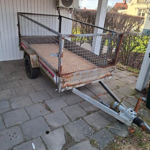 Släpvagn för allmän transport av gods. bromsad vagn med totalvikt 750 kg och max lastvikt 510 kg. Tjänstevikten är 240 kg. Flak med öppningsbara lämmar och stående sidor i metall. Utrustad med kulkoppling, stödhjul och bakre belysning med trianglar och reflexer. Lämplig för transport av exempelvis byggmaterial, trädgårdsavfall eller annat skrymmande gods inom angiven viktgräns. Snart veteran o redo för bygga på.....