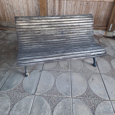 Vita, antika trädgårdsbänkar i trä och gjutjärn. Ribbad sits och ryggstöd samt stabila metallben. Passar för placering utomhus i trädgård, på uteplats eller altan. Färgen är sliten, tåligt trä utan röta. 750kr/st
