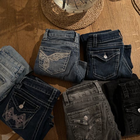 Ett par jeansshorts med dragsko i midjan (Lindex stl 146). Ett par mörkblå shorts med dragkedjefickor och resår i midjan (Swedemount stl 150). Ett par svarta träningsshorts med resår i midjan (Soc stl 146/152).